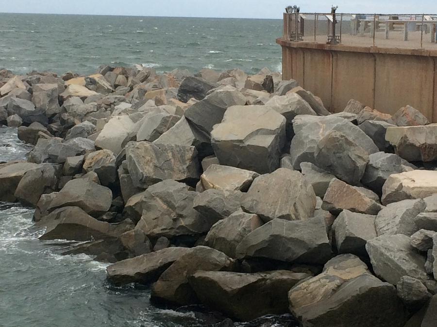 to limit erosion, massive chunks of granite armor the shorelines of the four artificial islands on the Chesapeake Bay Bridge-Tunnel